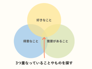 副業を長く続けるには、「好きなこと」「得意なこと」「人に求められること」の3つが重なるポイントを見つけるのがコツです。