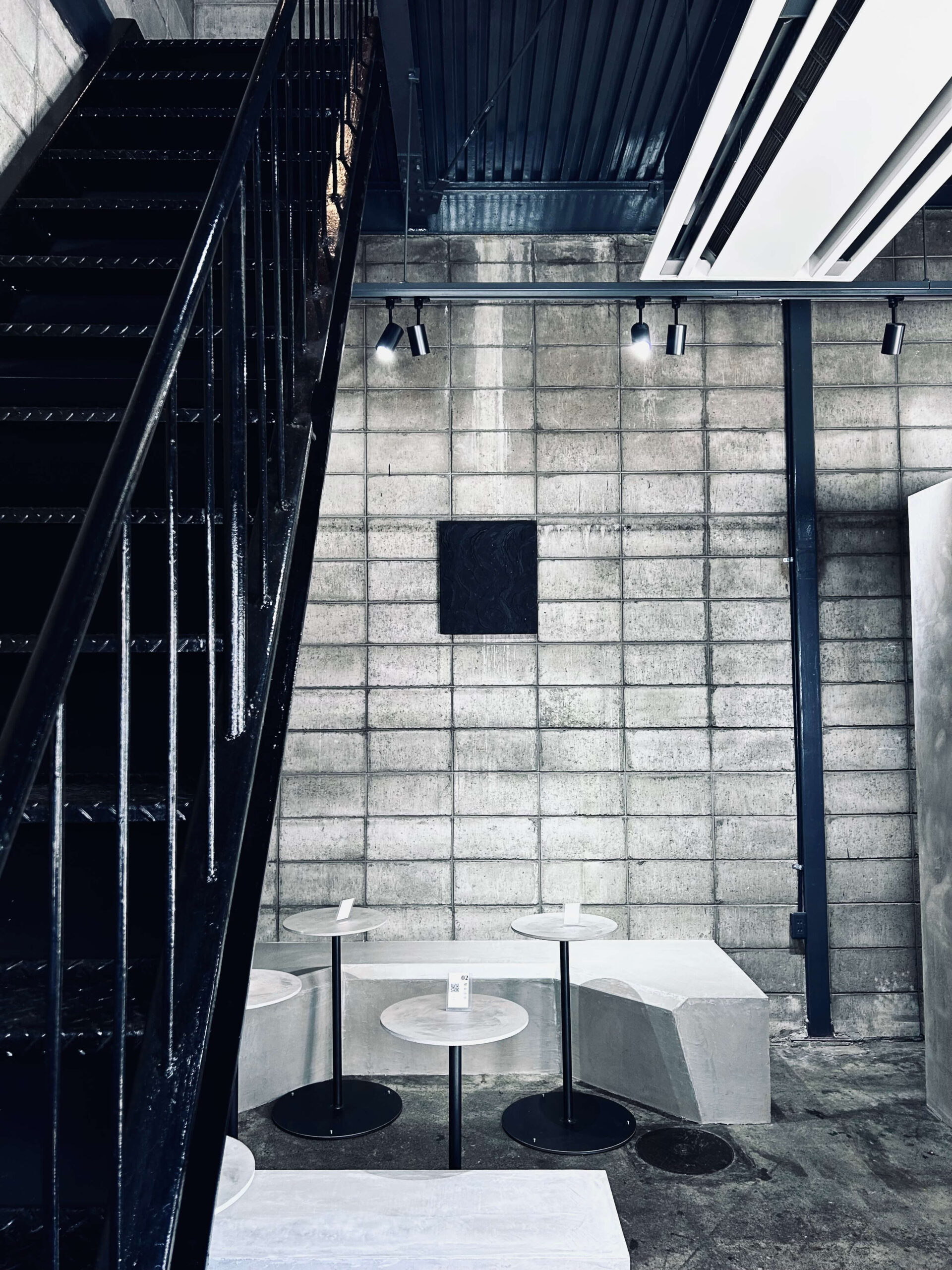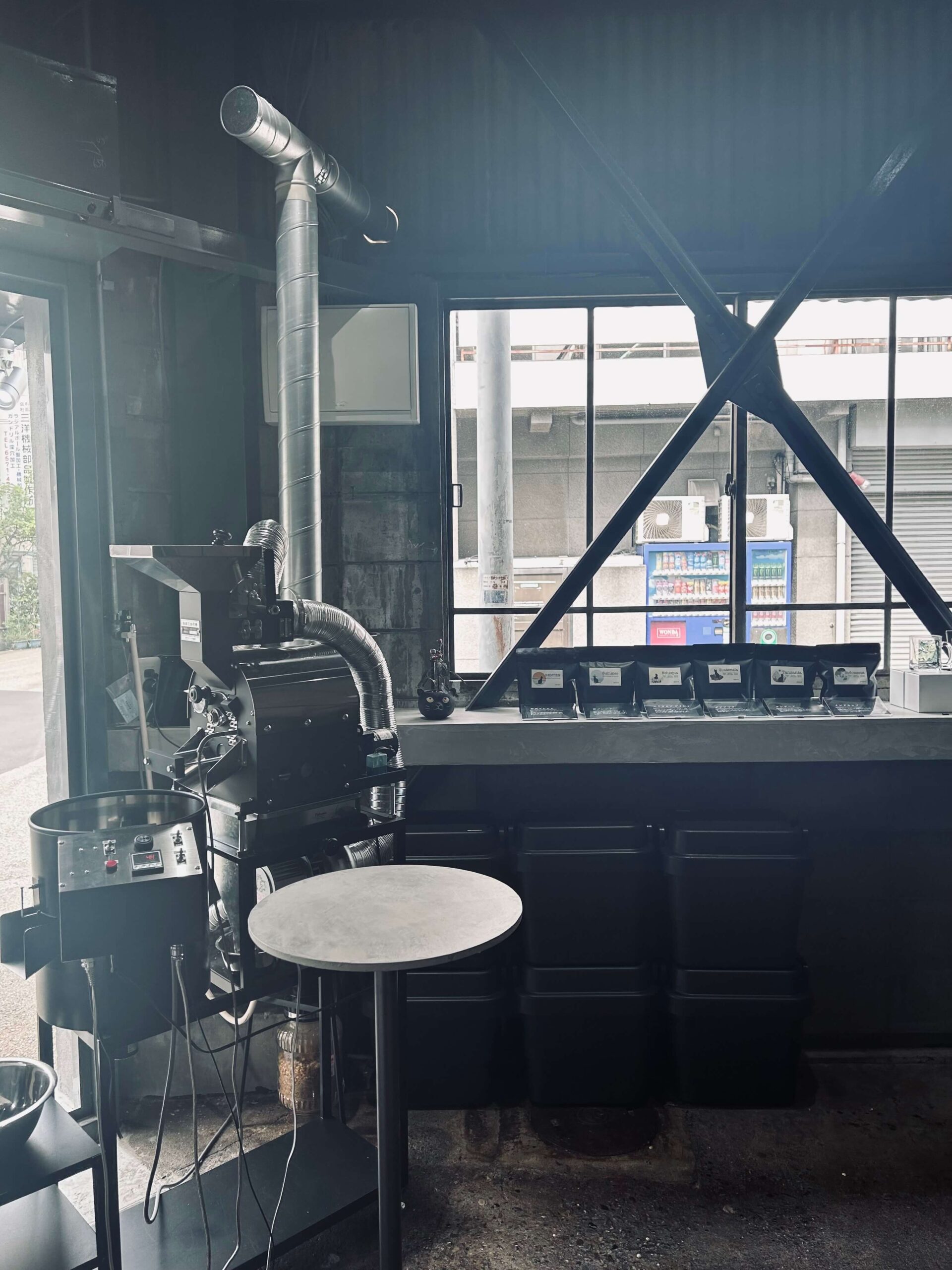 螺旋珈琲は、黒を基調としたインダストリアルな空間で、自家焙煎コーヒーを提供するカフェです。