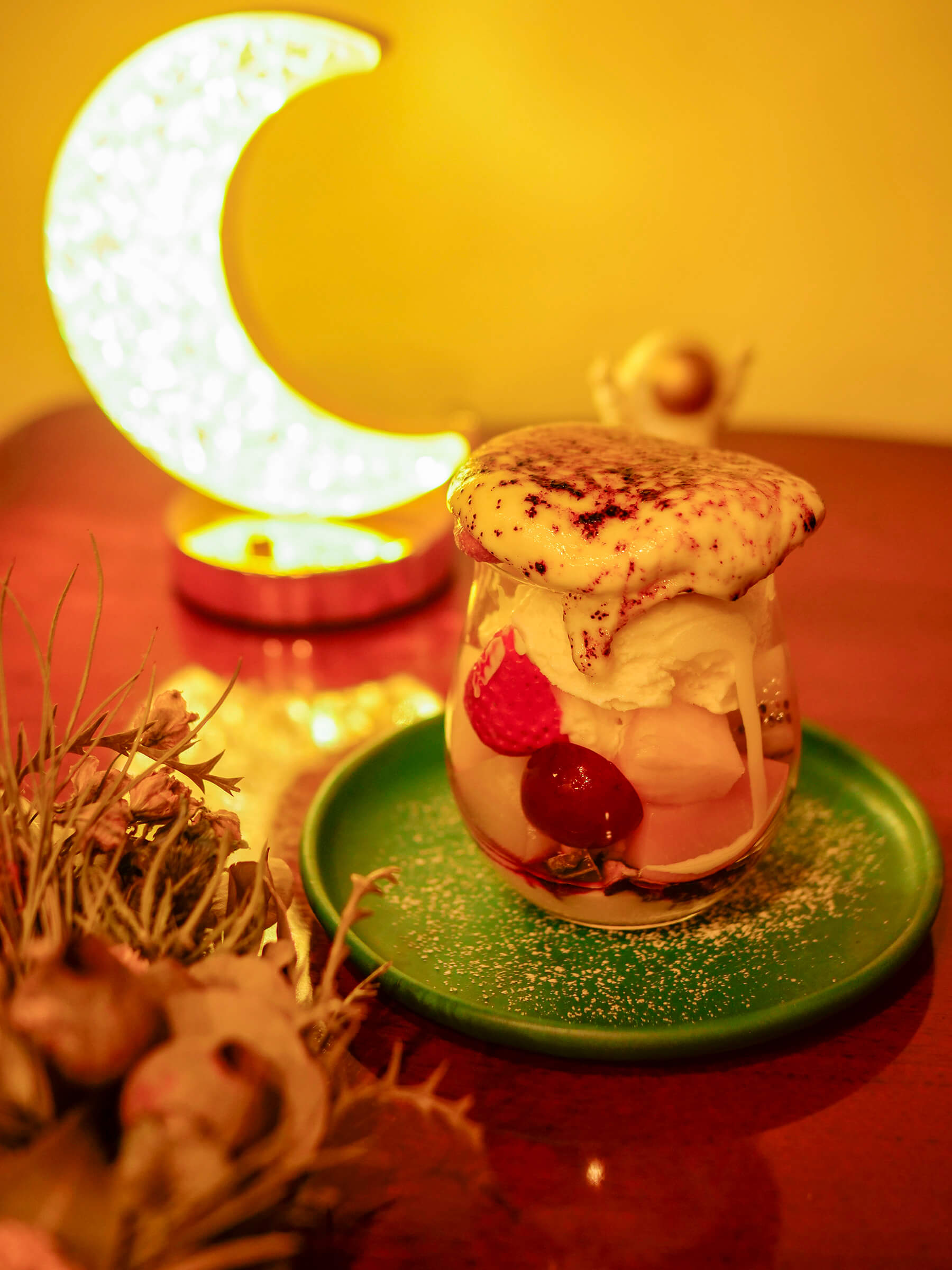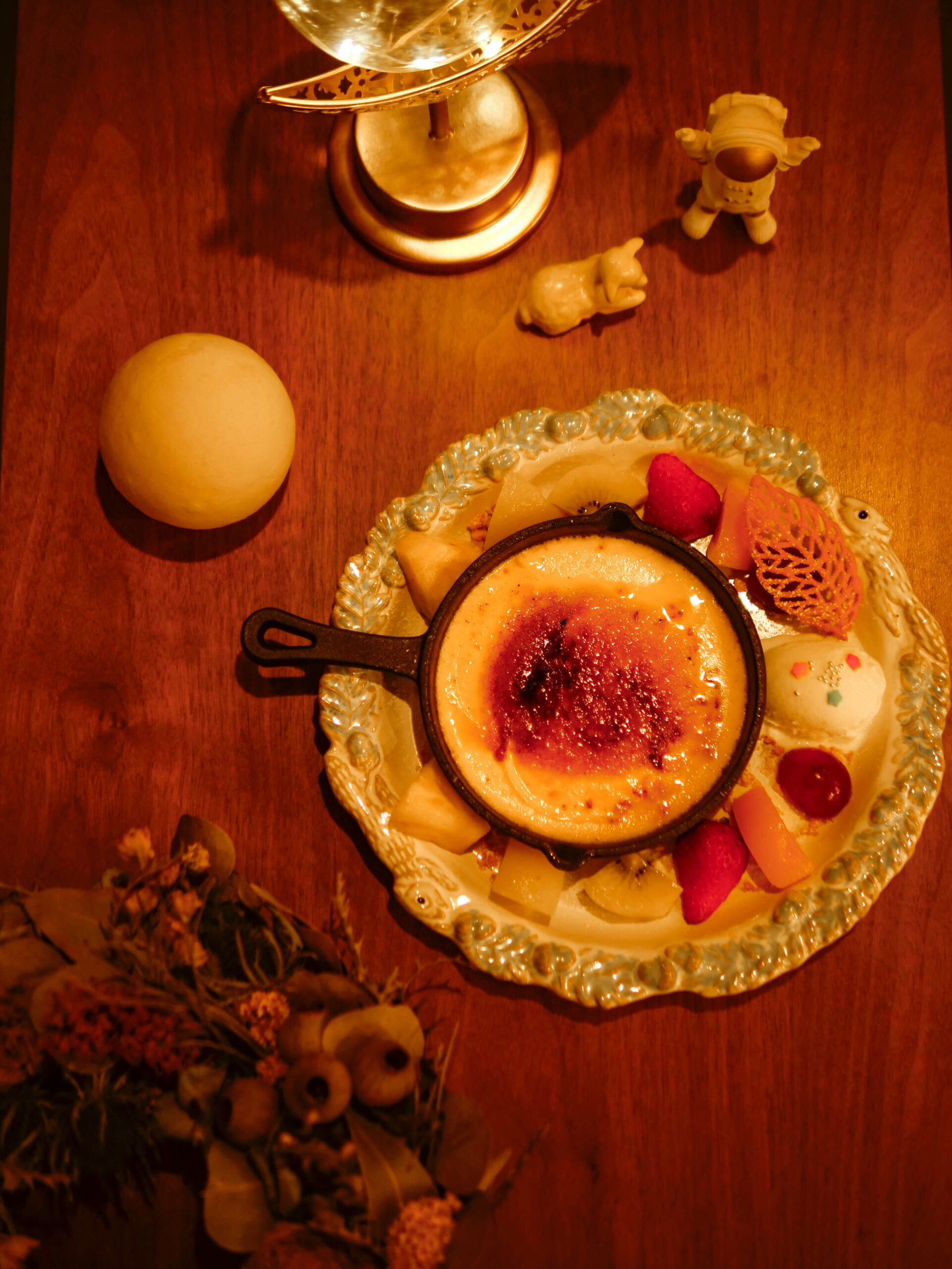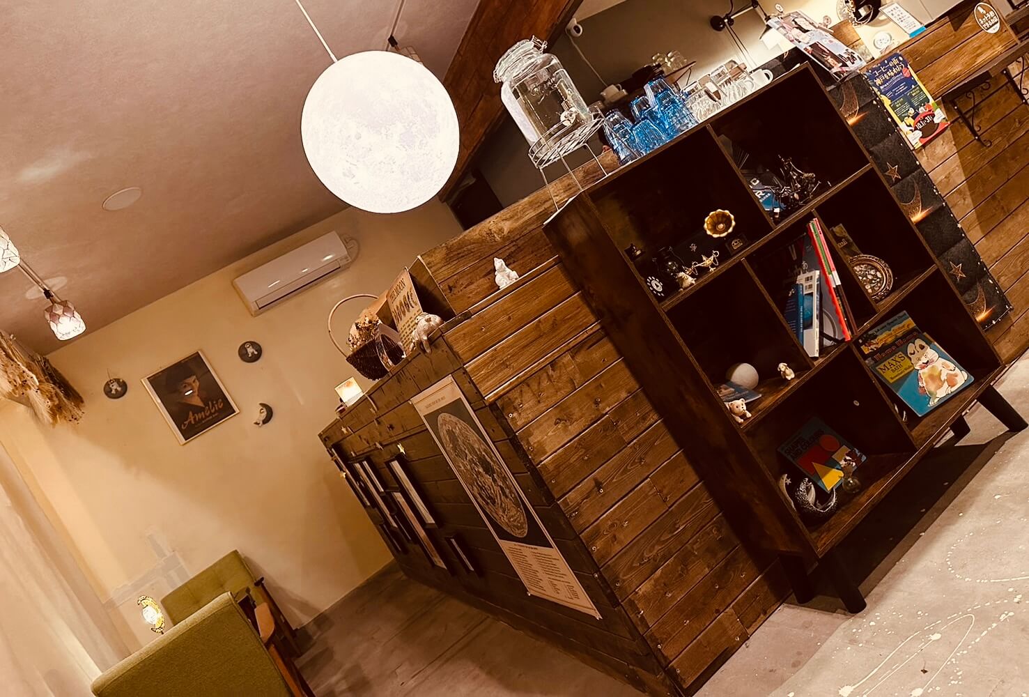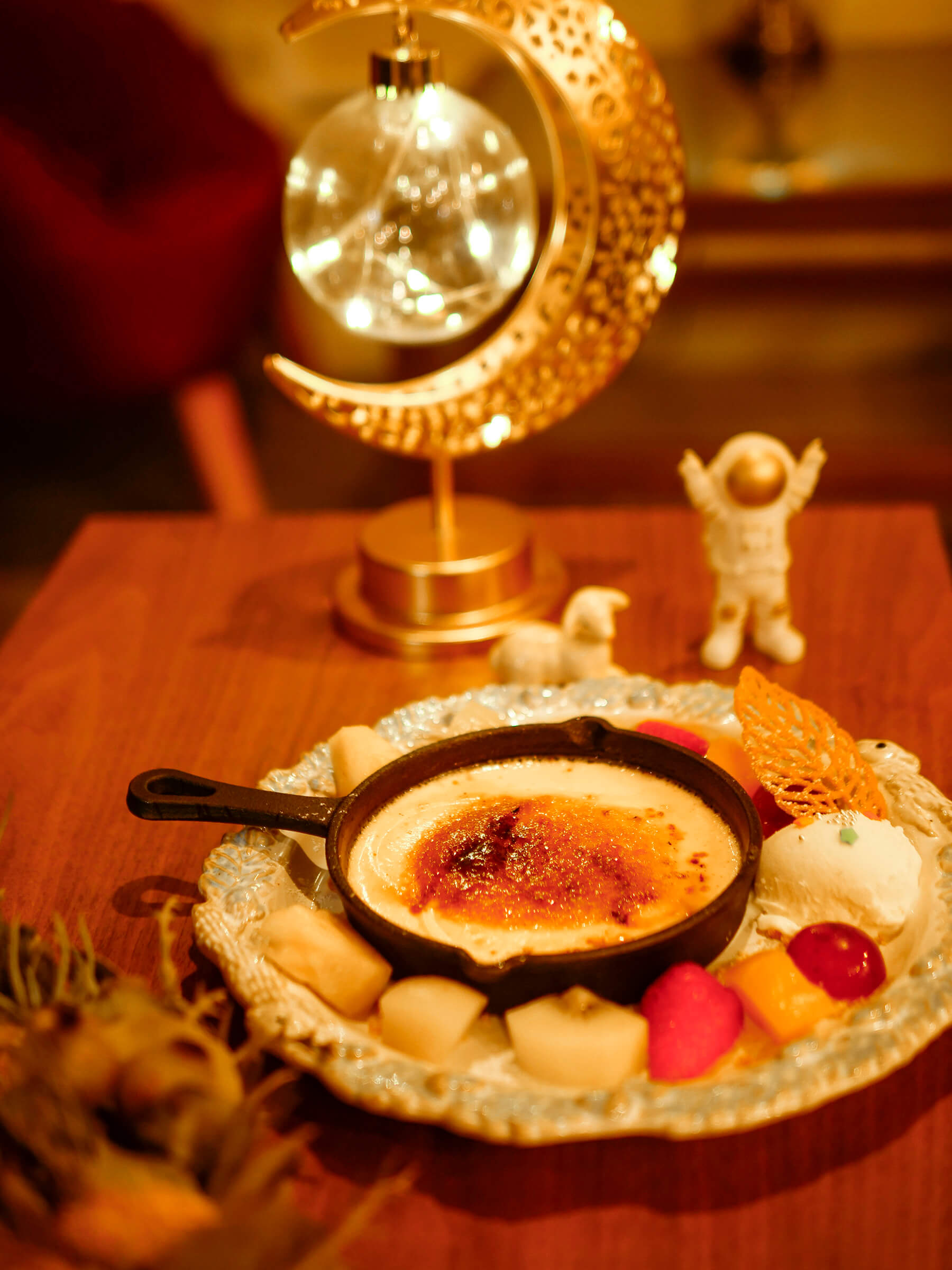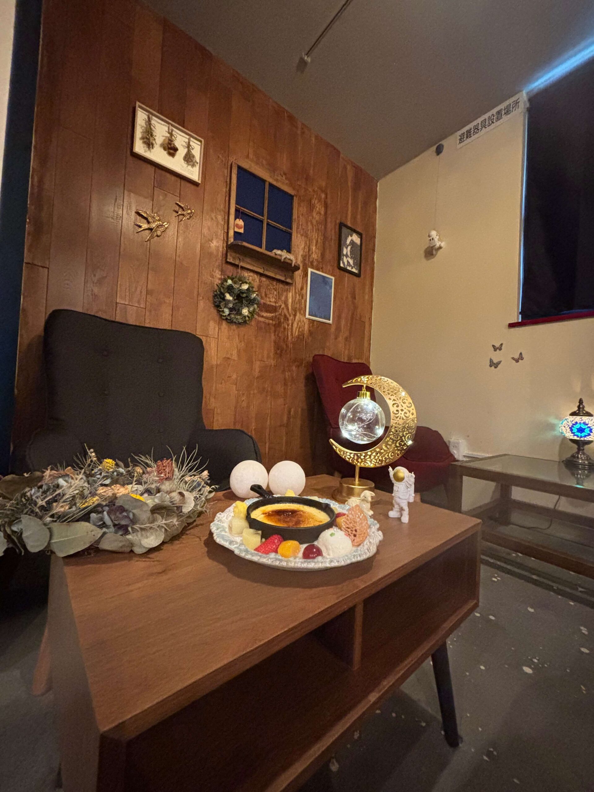 夜カフェ ブリュレ専門店です。夜の二軒目でお酒ではなく、ゆっくり夜の余韻を楽しめるような店を作りたいと思っていました。ブリュレは五感で楽しめる、フォトジェニックなデザートでもあります。他店で同じことをしていない唯一無二のカフェを作りました。リラックスできて、この場にいる自分が好きだなと感じる店づくりを意識しました。夜カフェのイメージを壊さないように、宇宙、月、宇宙飛行士、映画のアメリがコンセプトになっています。