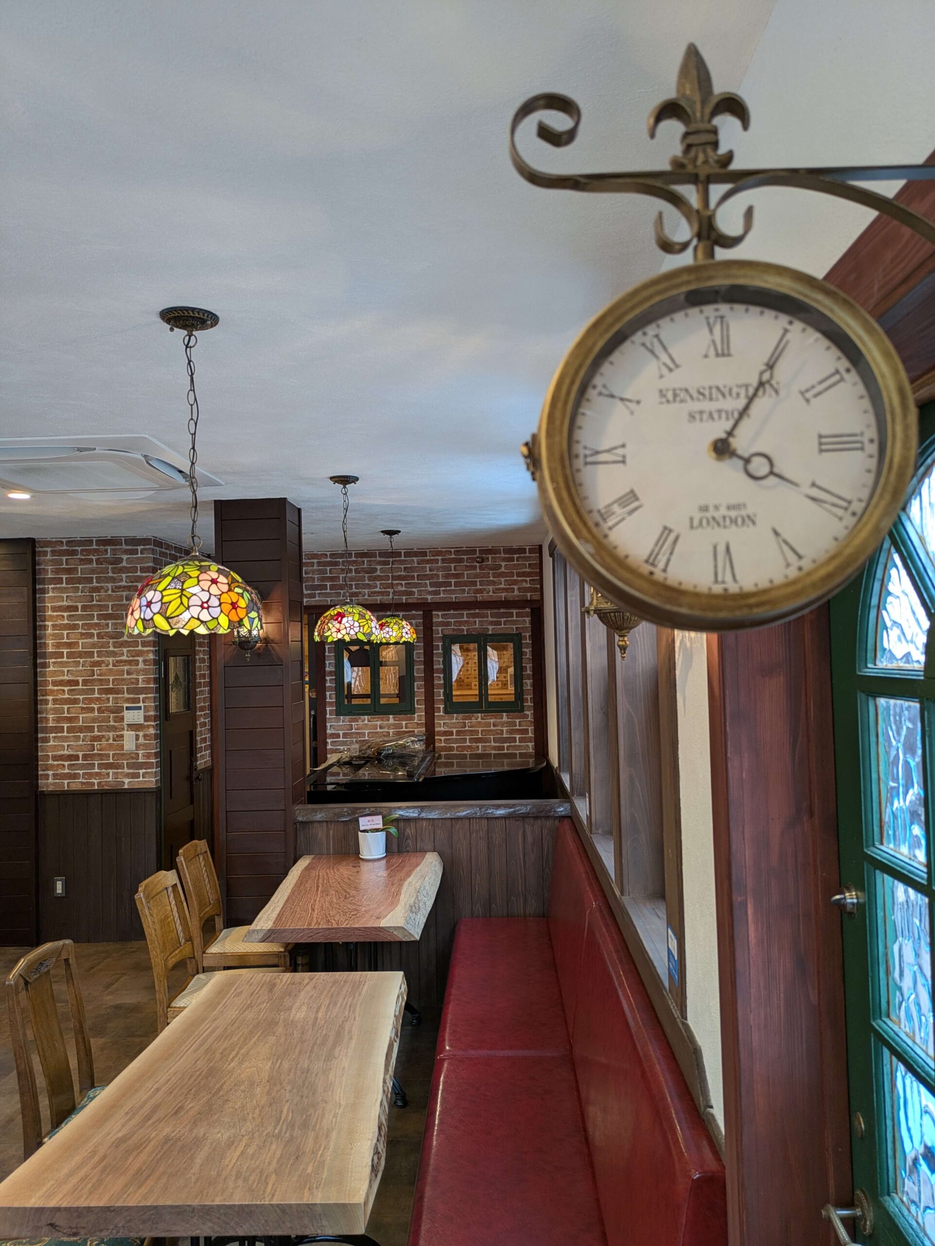 トレードマークは、赤いエントランスの扉とテラスのオーニング。店内のテーブルとカウンターは全て一枚板。扉と椅子はアンティーク。照明はステンドグラス。BGMは落ち着いたジャズ。