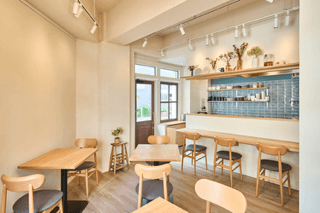 店舗外装は木々の緑が映える白を基調としたシンプルさで、内装は北欧をイメージさせるブルーをアクセントに入れています。