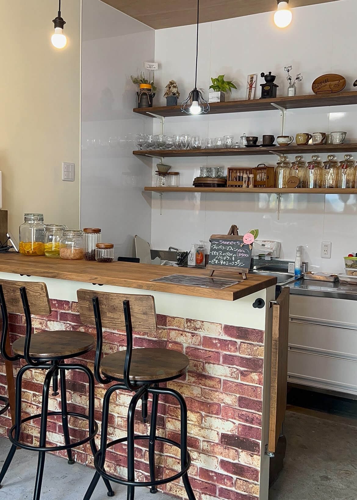 窓と扉はガラスなので外から中が見えるようになっています。内装は、以前両親が営んでいた金物屋さんをリノベーションしました。壁や床を一部そのまま活用し、できる箇所はDIYで作り上げました。レンタルスペースとしてとにかく使いやすいキッチン、空間作りにこだわりました。