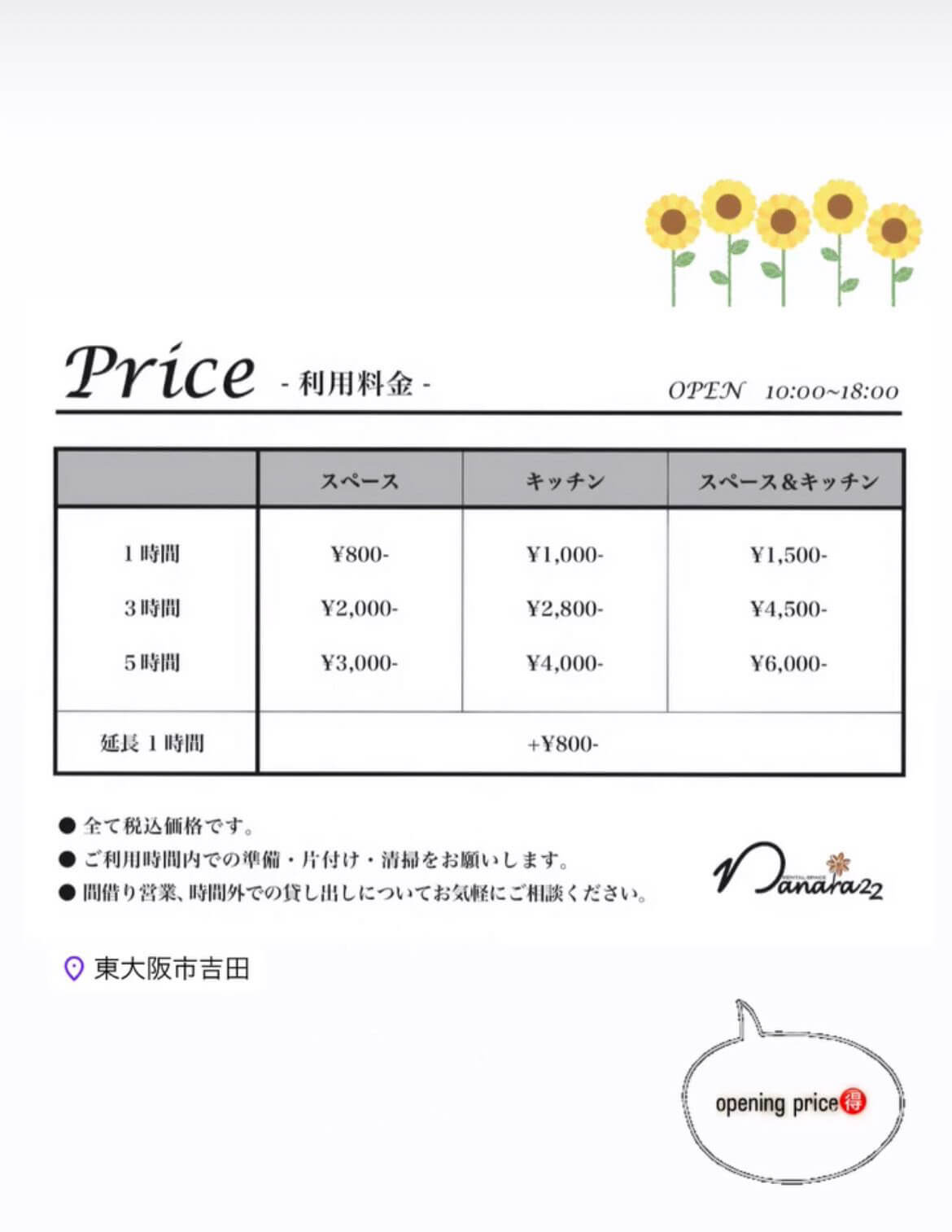 「nanara」は、ハワイ語で「ひまわり」の意味。「22」は子どもの誕生月を足した数字。好きな色黄色の花の代表格がひまわりと、ゾロ目ということでこれに決めました。利用方法は、イベント出店、ワークショップ、間借りカフエ、会議利用、持ち寄りパーティー、など無限大です。老若男女問わずご利用いただけます。ご都合のいいシーンでご活用下さい。
