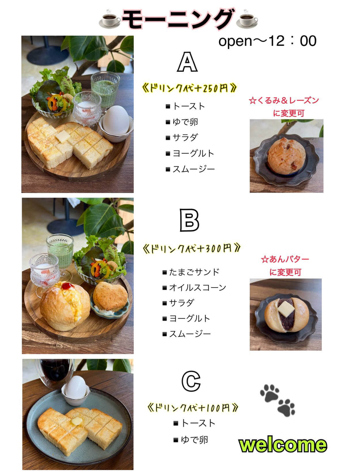 モーニングメニューは12:00まで提供しています。シンプルなものとブランチ代わりになる豊富な内容のものがご用意ございます。ランチは提供しておりません。