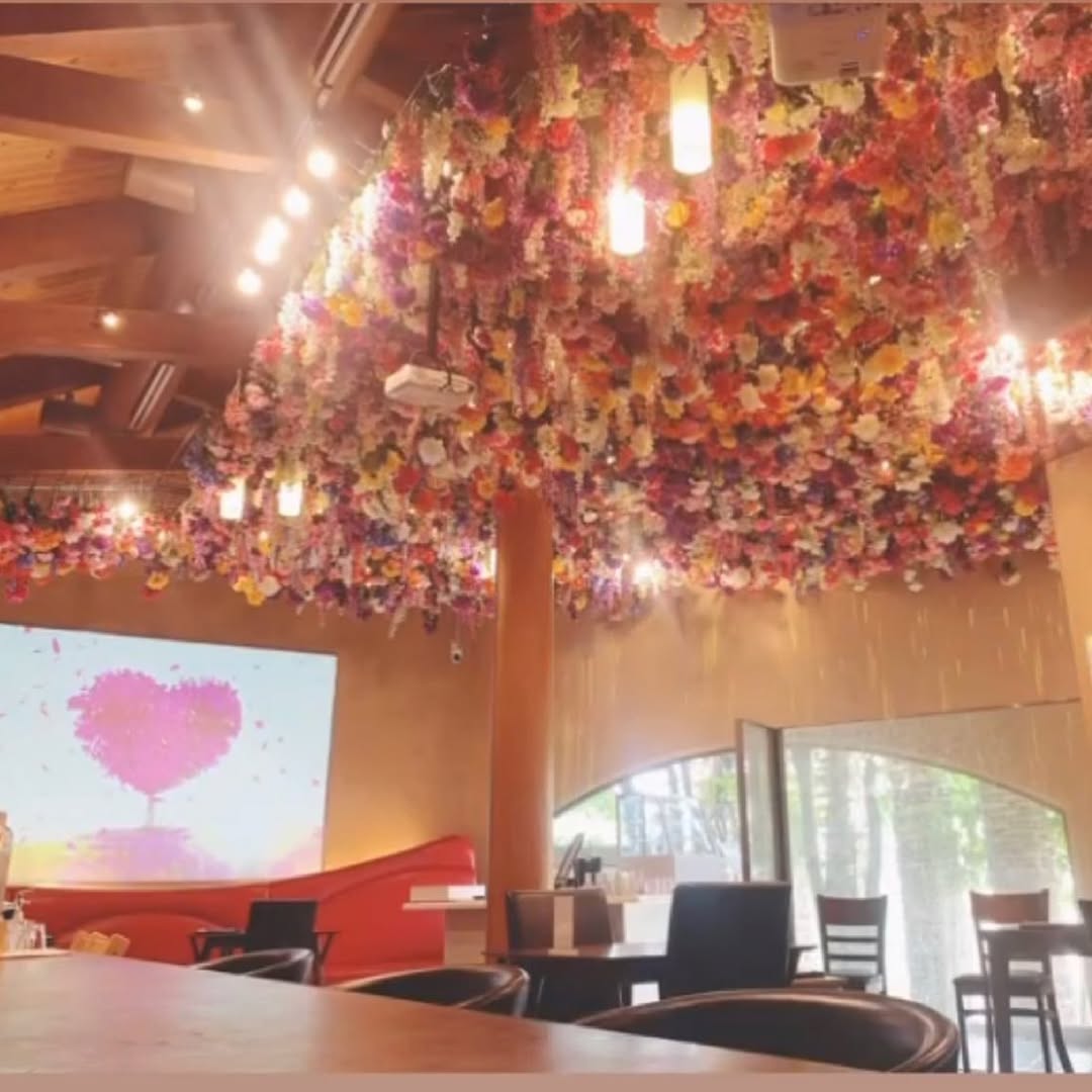 店内に一歩足を踏み入れると、天井から広がるウォールフラワーやプロジェクションマッピングが彩る、まるで物語の世界のような空間が広がります。カウンターテーブルの中にも花が敷き詰められ、どこを切り取っても写真映えする華やかさが魅力です。