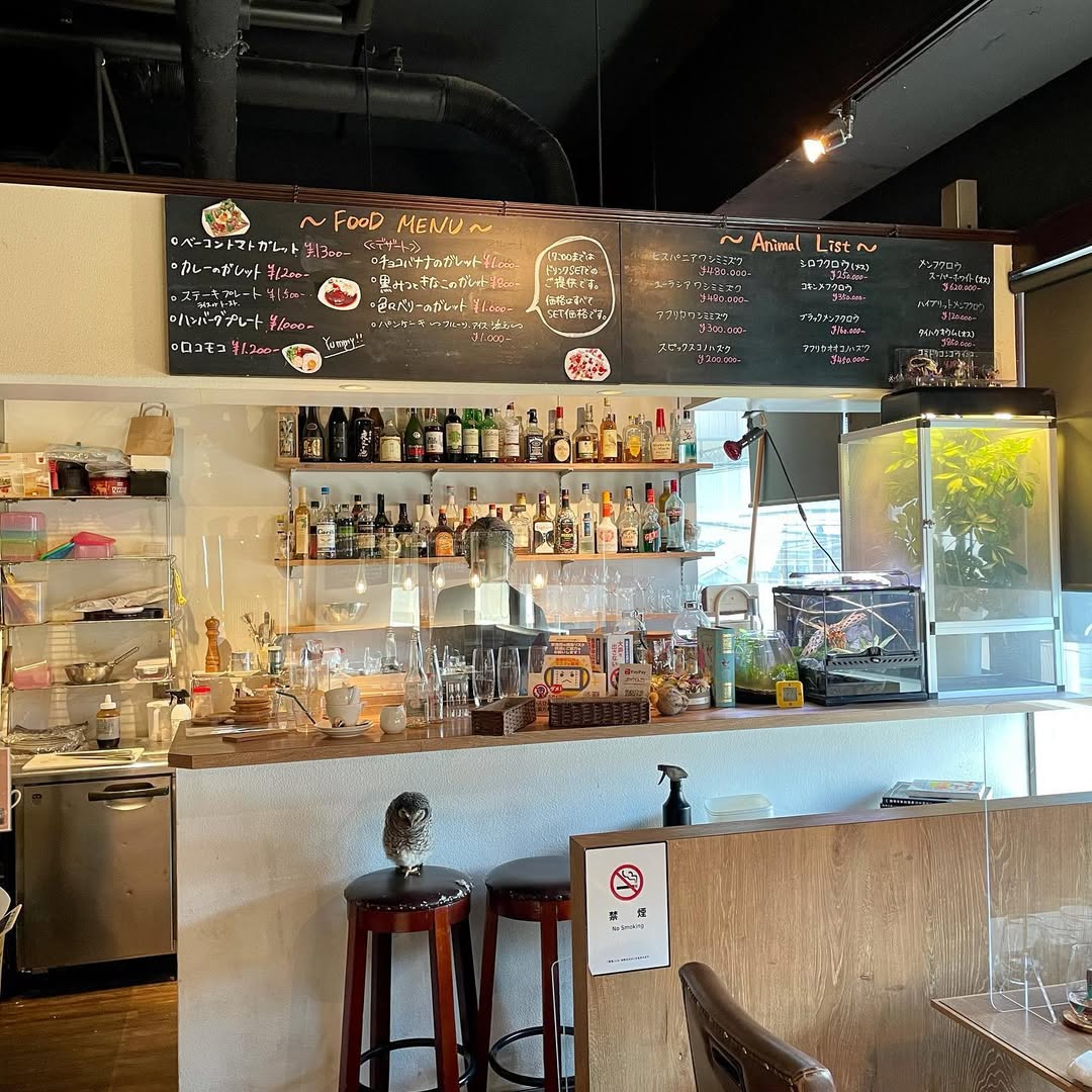 店内の大きなショーケースには数羽のフクロウが暮らしており、来店者をじっと見つめる愛らしい姿に癒されます。ふれあいコーナーでは、小さなフクロウに直接触れたり腕に乗せてもらったりと特別な体験が可能。さらに、フクロウの販売も行われています。カフェメニューも豊富で、もちもちのガレットや地元の箕面サイダーが人気。近隣の方がランチ利用したり、開店から閉店まで滞在する常連客もいるなど、幅広い層に親しまれています。