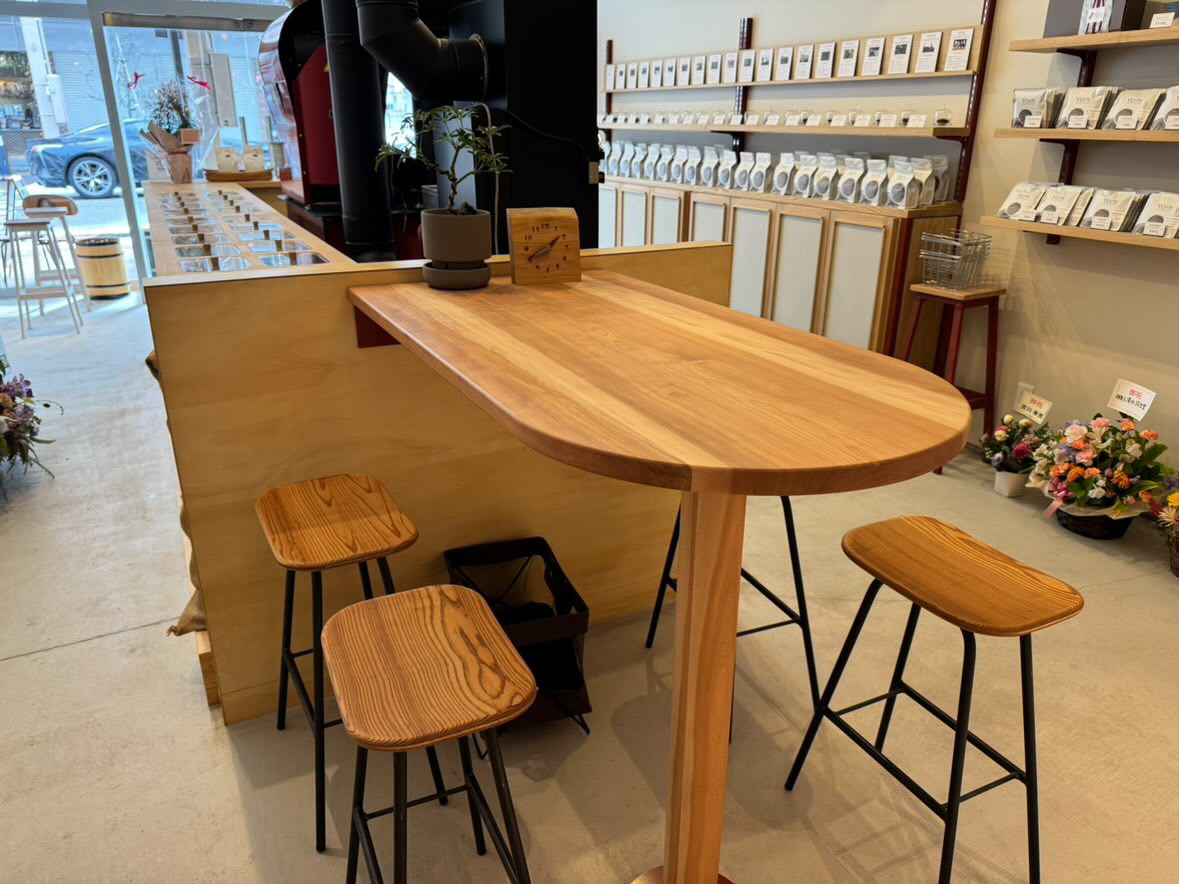 赤い焙煎機を店舗中央に配置して、雪国飛騨で北欧風にシンプルに店舗をデザイン、家具も飛騨の匠に作っていただきました。カウンターもコーヒーづくりに没頭できるように改装しました。
